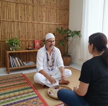 Imagine um espaço seguro onde você pode falar das suas questões espirituais e emocionais sem divisões. No atendimento, as conchas e as cartas trazem o diagnóstico simbólico, enquanto a escuta terapêutica ajuda você a metabolizar essas informações, transformando símbolos em atitudes práticas