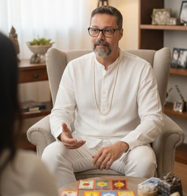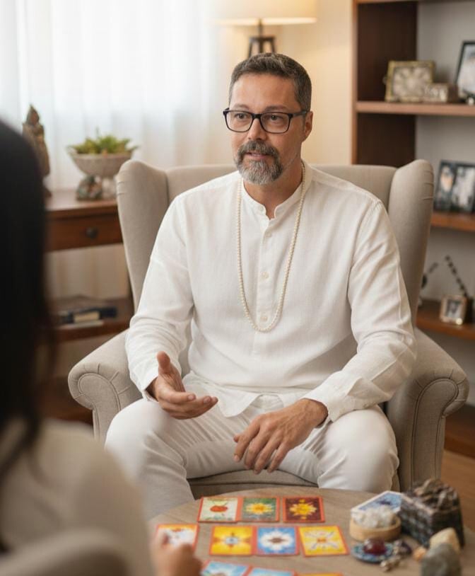 Consulta com búzios em perspectiva terapêutica e espiritual, guiada por um sacerdote.